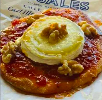 Ines Rosales toast with tomato confit, goat curl, honey and crunchy almonds.