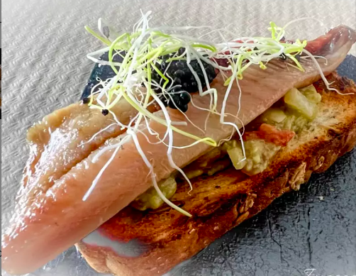 Smoked sardine, on seeded bread and homemade guacamole, caviar substitutes and sprouts.